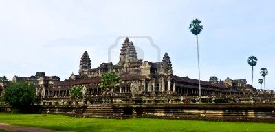 Over a period of 300 years, between 900 and 1200 AD, the Khmer Kingdom of Angkor produced some of the world's most magnificent architectural masterpieces on the northern shore of the Tonle Sap, near the present town of Siem Reap. The Angkor area stretches 15 miles east to west and 5 miles north to south. Some 72 major temples or other buildings dot the area. Suryavarman II built the principal temple, Angkor Wat, between 1112 and 1150. With walls nearly one-half mile on each side, Angkor Wat portrays the Hindu cosmology with the central towers representing Mount Meru, home of the gods; the outer walls, the mountains enclosing the world; and the moat, the oceans beyond. Angkor Thom, the capital city built after the Cham sack of 1177, is surrounded by a 300-foot wide moat. Construction of Angkor Thom coincided with a change from Hinduism to Buddhism. Temples were altered to display images of the Buddha, and Angkor Wat became a major Buddhist shrine.